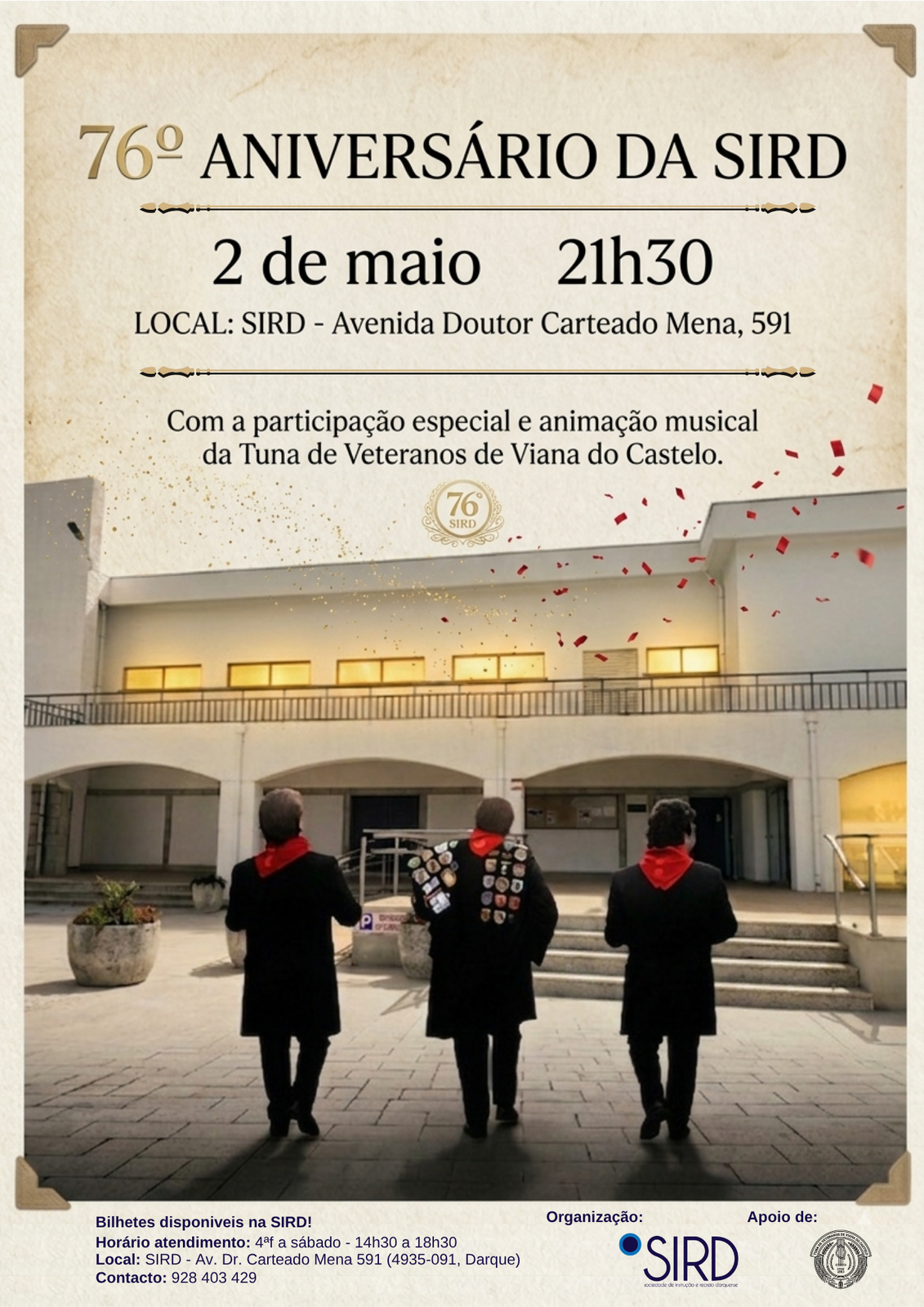 A Sociedade de Instrução e Recreio Darquense (SIRD) celebra mais um ano de história e convida toda a comunidade a fazer parte desta festa especial. Com a presença da Tuna de Veteranos de Viana do Castelo, promete-se um momento cheio de música, tradição e boa energia. Junta-te a nós e vem celebrar!
