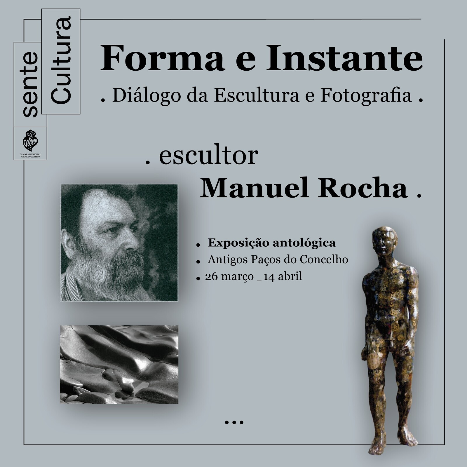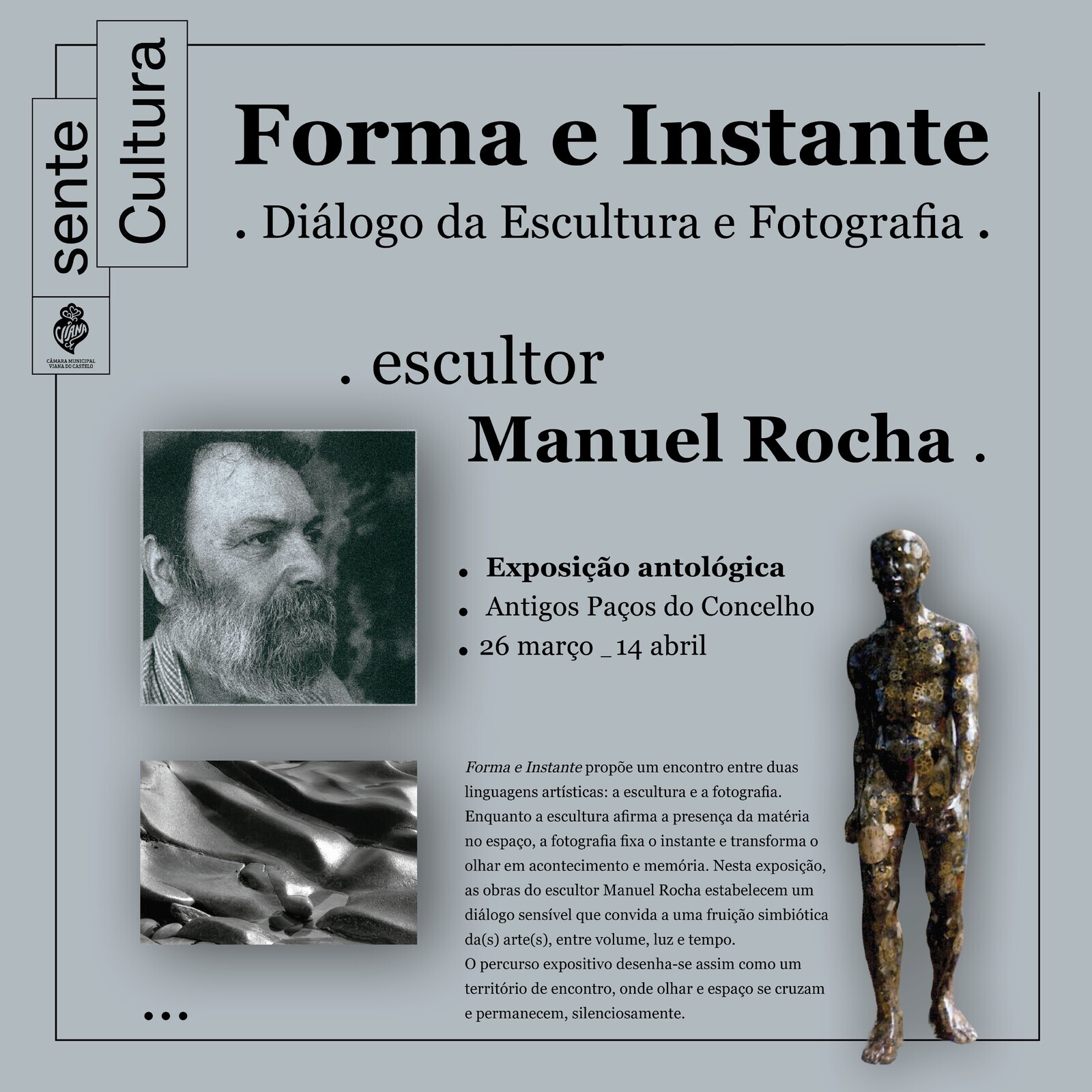 Enquanto a escultura afirma a presença da matéria no espaço, a fotografia fixa o instante e transforma o olhar em acontecimento e memória. Nesta exposição, as obras do escultor Manuel Rocha estabelecem um diálogo sensível que convida a uma fruição simbiótica da(s) arte(s), entre volume, luz e tempo.