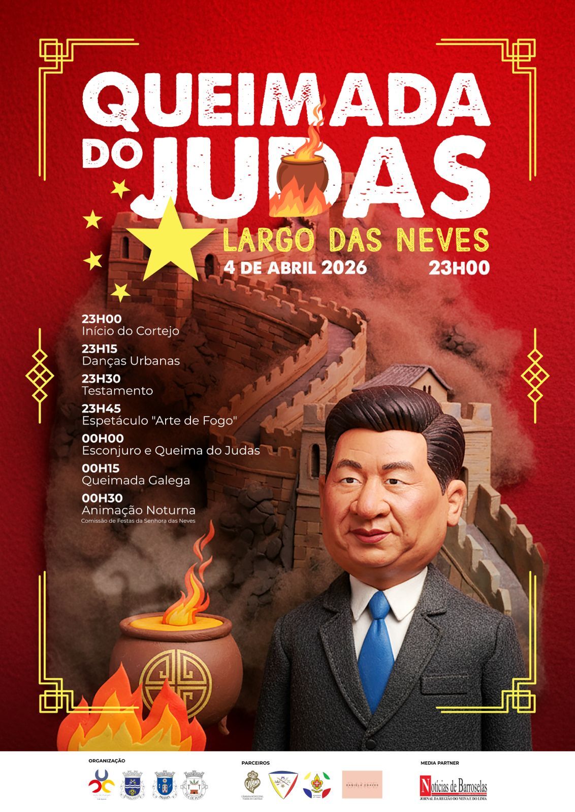 Mantendo na estrutura o testamento e o auto de fé do Judas, o conceito ajusta-se aos tempos de hoje e define como matriz diferenciadora a leitura do esconjuro acompanhado da tradicional queimada galega, com o propósito de, antes de ser queimado, exorcizar os pecados do Judas e permitir uma morte com absolvição e perdão. Este ano, na noite de 4 de abril, o Judas, o cenário e o cortejo terão tons da terra do dragão, do chá e da muralha. O espetáculo popular incluirá dança, música, fogo e sátira.