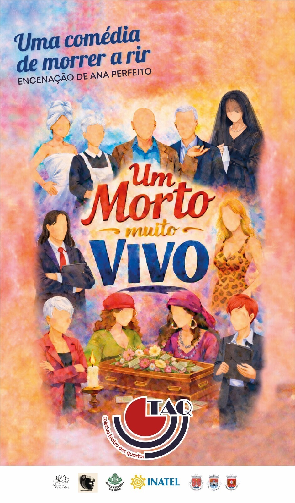 Numa casa bem recheada, uns rostos mais chorosos, outros mais indiferentes, outros mais maldosos… Um funeral… Um testamento que existe ou não? Uma prostituta? Uma vidente? Uma viúva? Alguns amantes? As Finanças? Um morto? Ou alguém que está bem vivo? Máscaras que caem quando as verdades se descobrem… Uma comédia deliciosa que vai surpreender!