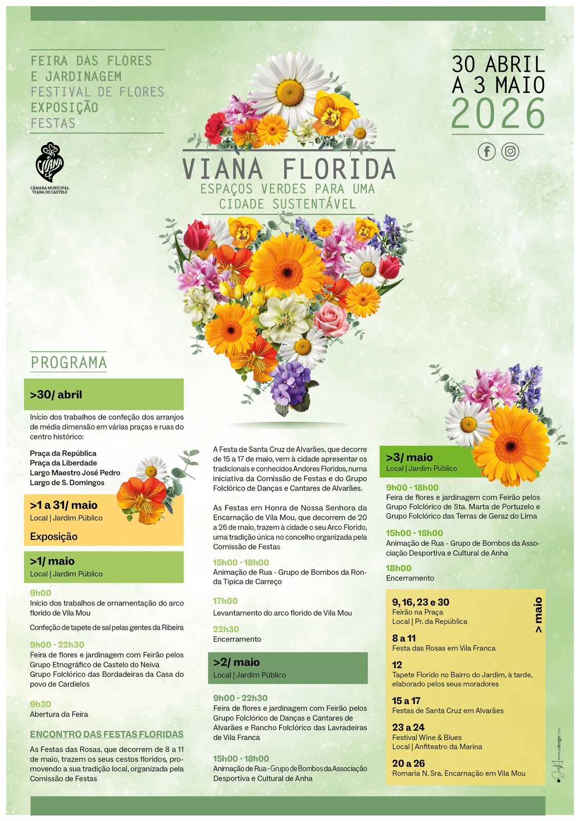 O programa integra Feira das Flores e Jardinagem, Festival de Flores, Exposição e Festas Floridas. Arranca a 30 de abril, quinta-feira, com a confeção dos arranjos floridos de média dimensão, entre 3 e 4 metros de altura, na Praça da República, Praça da Liberdade, Largo Maestro José Pedro e Largo de São Domingos.