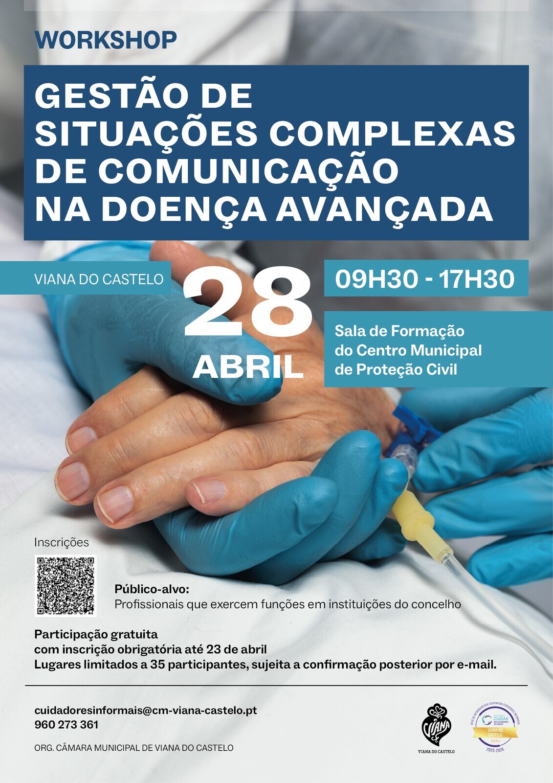 👉 Inscreva-se através do QR Code que consta do cartaz ou através do link: https://www.cm-viana-castelo.pt/areas-de-atividade/desporto-e-saude/saude/projetos/programa-municipal-de-apoio-aos-cuidadores-informais/gestao-de-situacoes-complexas-de-comunicacao-na-doenca-avancada