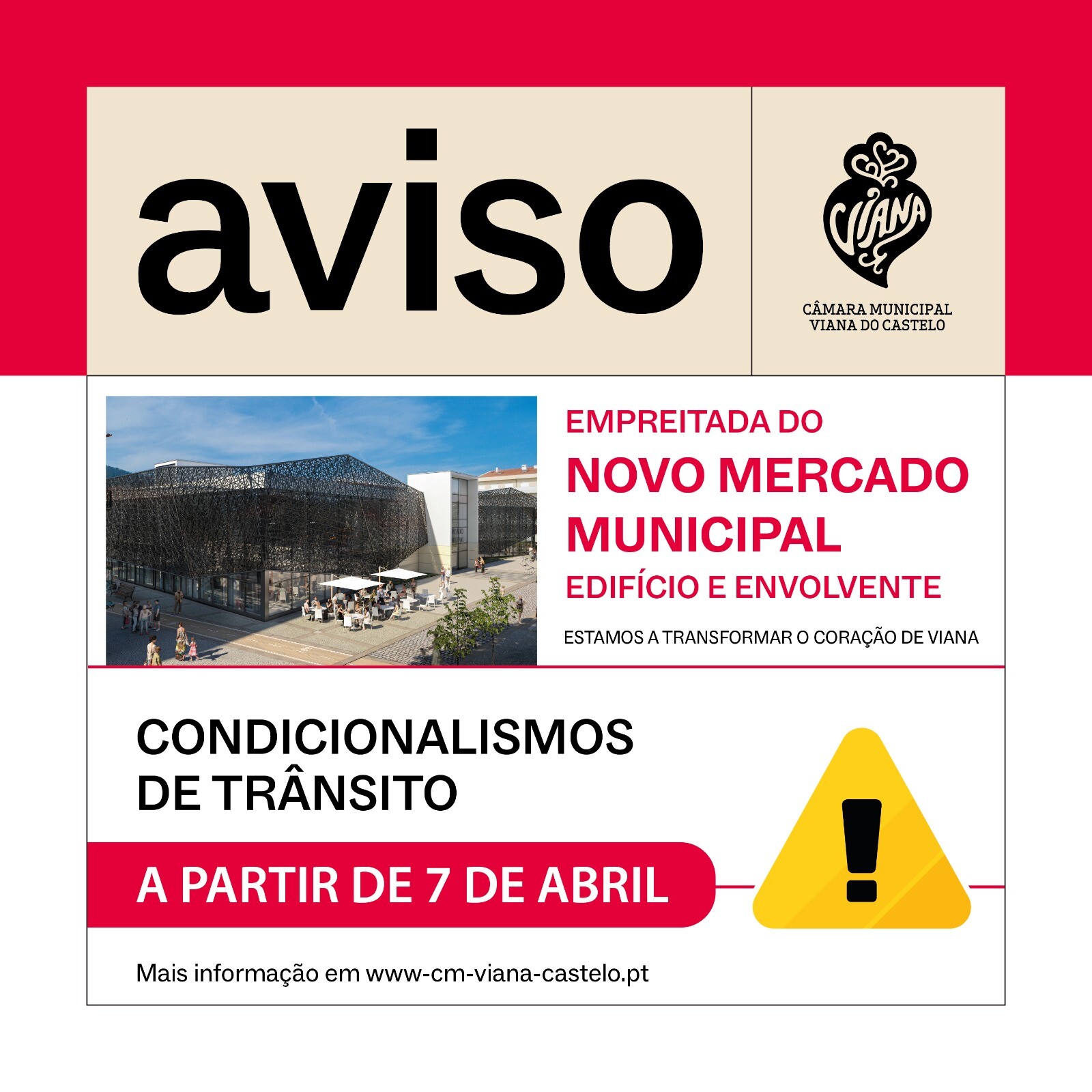 A partir de terça-feira, dia 07 de abril, o avanço dos trabalhos de construção do novo Mercado Municipal de Viana do Castelo obriga a um conjunto de alterações de trânsito nas imediações do estaleiro da obra, permitindo a empreitada que promete transformar o coração de Viana do Castelo.