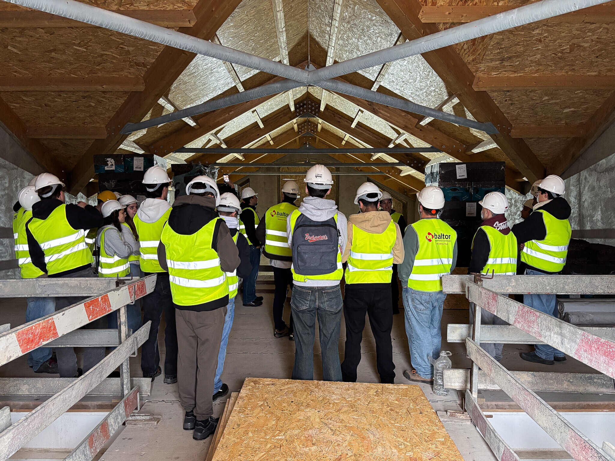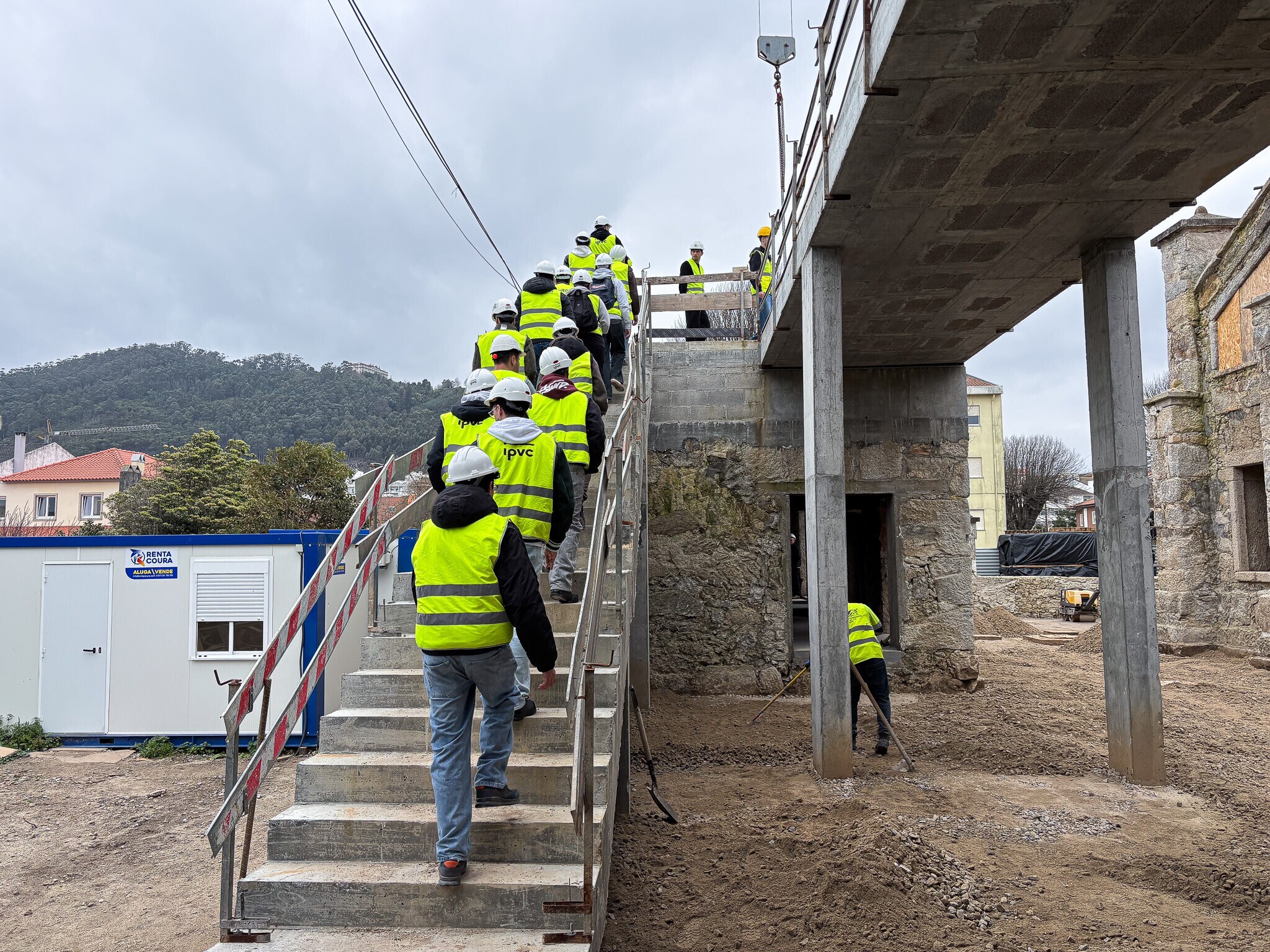 Estudantes da Licenciatura de Engenharia Civil e do Ambiente e do curso CTESP -Construção e Reabilitação tiveram oportunidade de visitar a obra e de conhecer, de perto, as soluções de eficiência energética e circulares que integram a obra do Viana STARTS, incluindo o abastecimento do edifício por energias renováveis, utilizando recursos locais e até um novo sistema para armazenar energia renovável excedente na forma de hidrogénio.