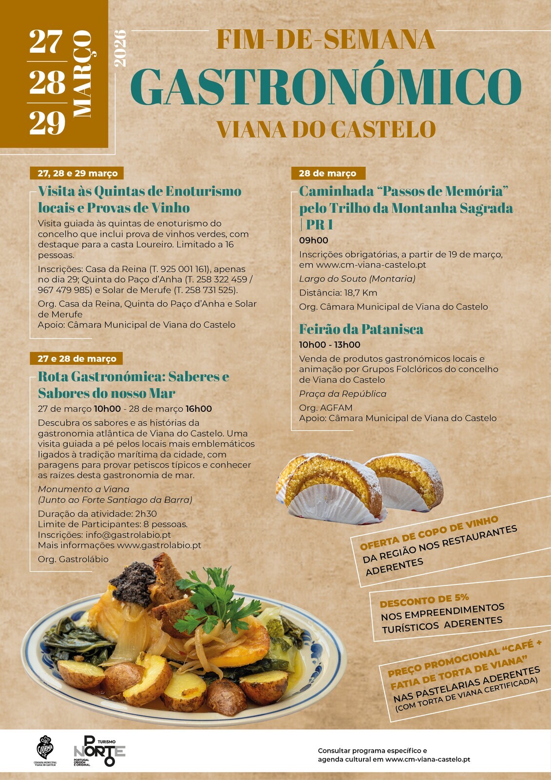 A 28 de março, realiza-se a Caminhada Passos de Memória pelo PR 1 – Trilho da Montanha Sagrada | PR 1, na freguesia da Montaria. Nesse mesmo dia, 28 de março, a gastronomia é também destaque no Feirão da Patanisca, das 10h00 às 13h00, na Praça da República, num momento de venda de produtos gastronómicos locais e animação por grupos folclóricos do concelho.