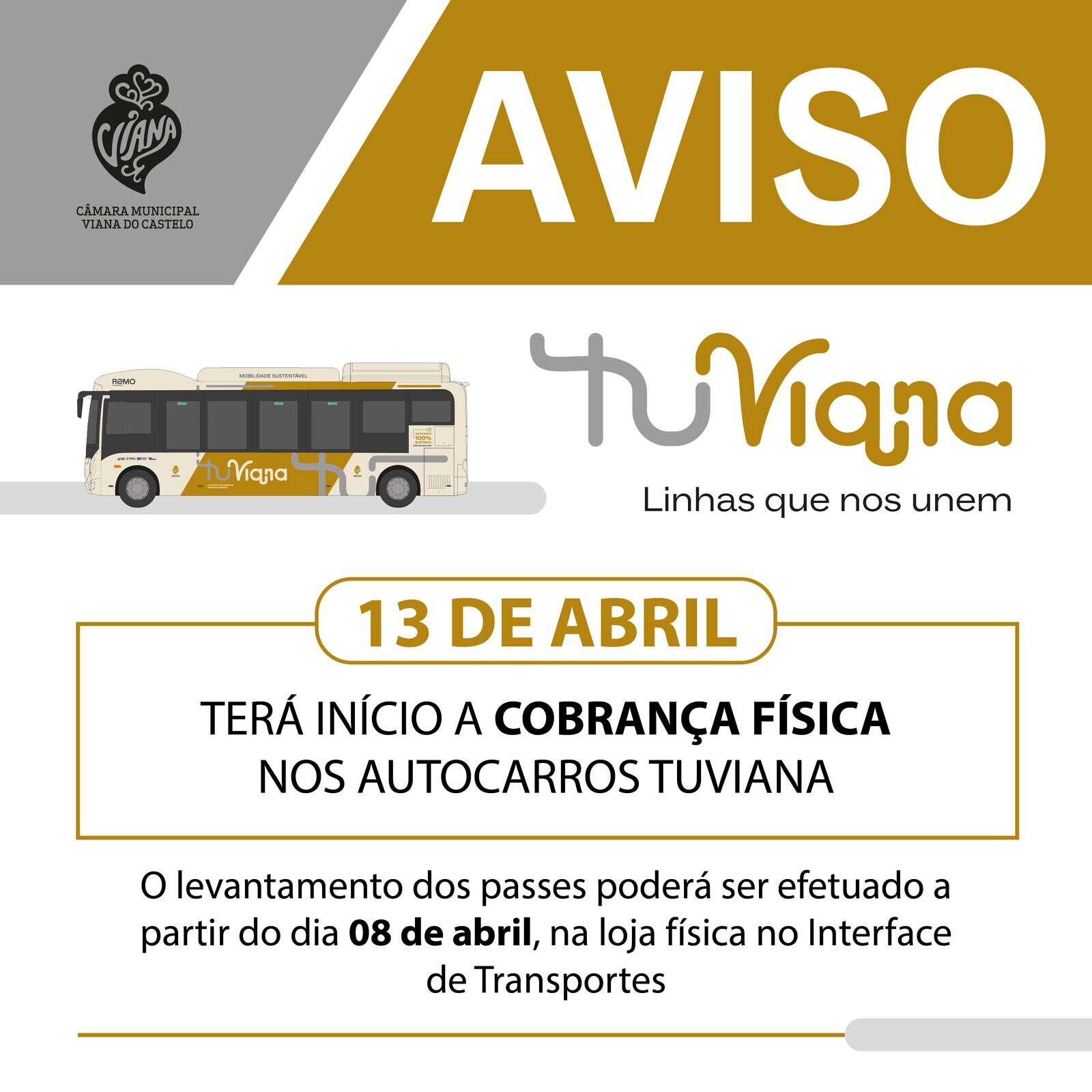A Câmara Municipal de Viana do Castelo informa que, na próxima segunda-feira, dia 13 de abril, terá início a cobrança física de bilhete ou passe nos autocarros da operação TUViana – Transportes Urbanos de Viana.