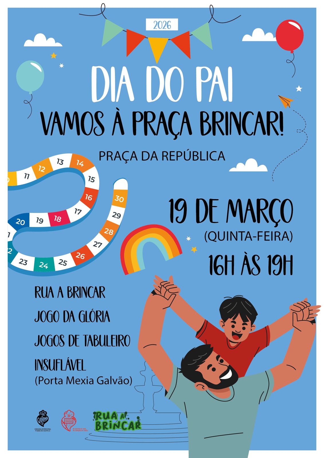 A Câmara Municipal de Viana do Castelo preparou um programa comemorativo do Dia do Pai que visa convidar crianças, jovens, pais e famílias a celebrarem a efeméride na Praça da República com jogos lúdicos e didáticos.