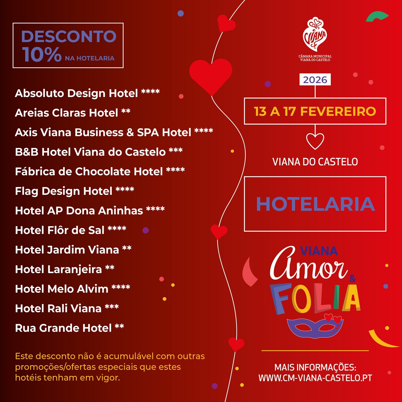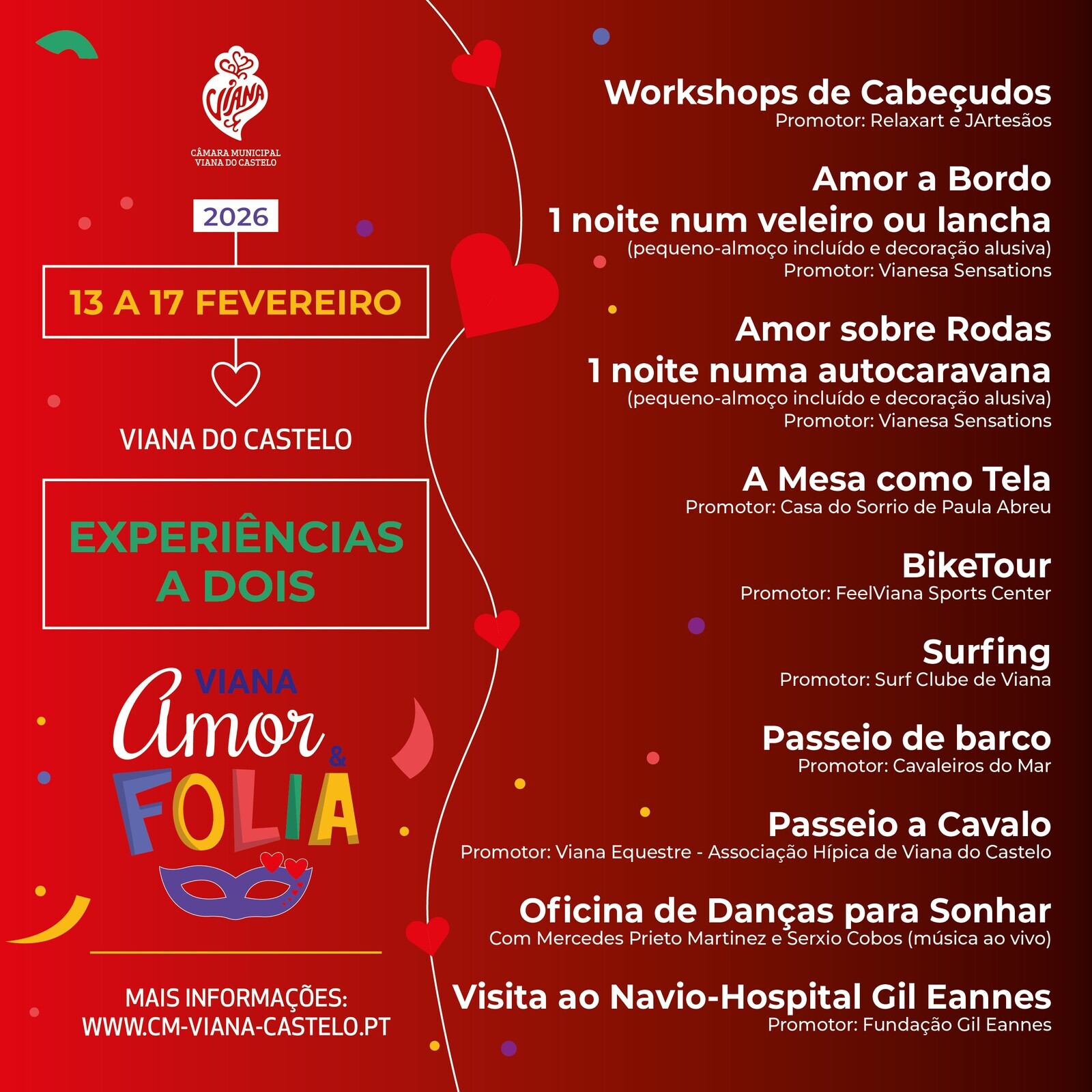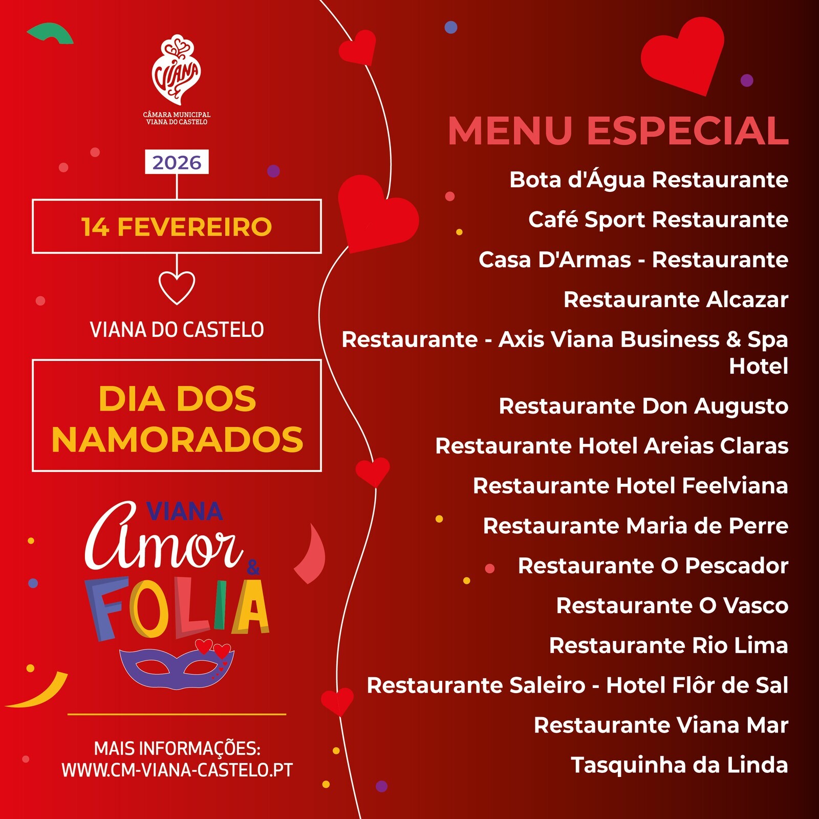 Entre os dias 13 e 17 de fevereiro, a Câmara Municipal de Viana do Castelo promove a iniciativa “Viana Amor & Folia”, num verdadeiro convite a que vianenses e visitantes celebrem o Carnaval e o Dia dos Namorados no centro histórico da cidade.