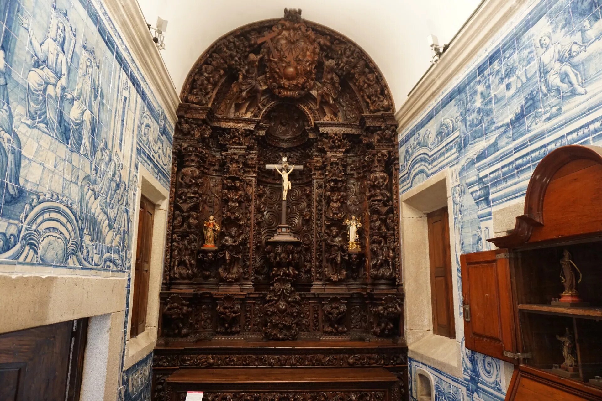 O edifício original tem ainda uma pequena capela com um magnífico retábulo de talha Barroca e as paredes decoradas por azulejos assinados pelo mestre Policarpo de Oliveira Bernardes.