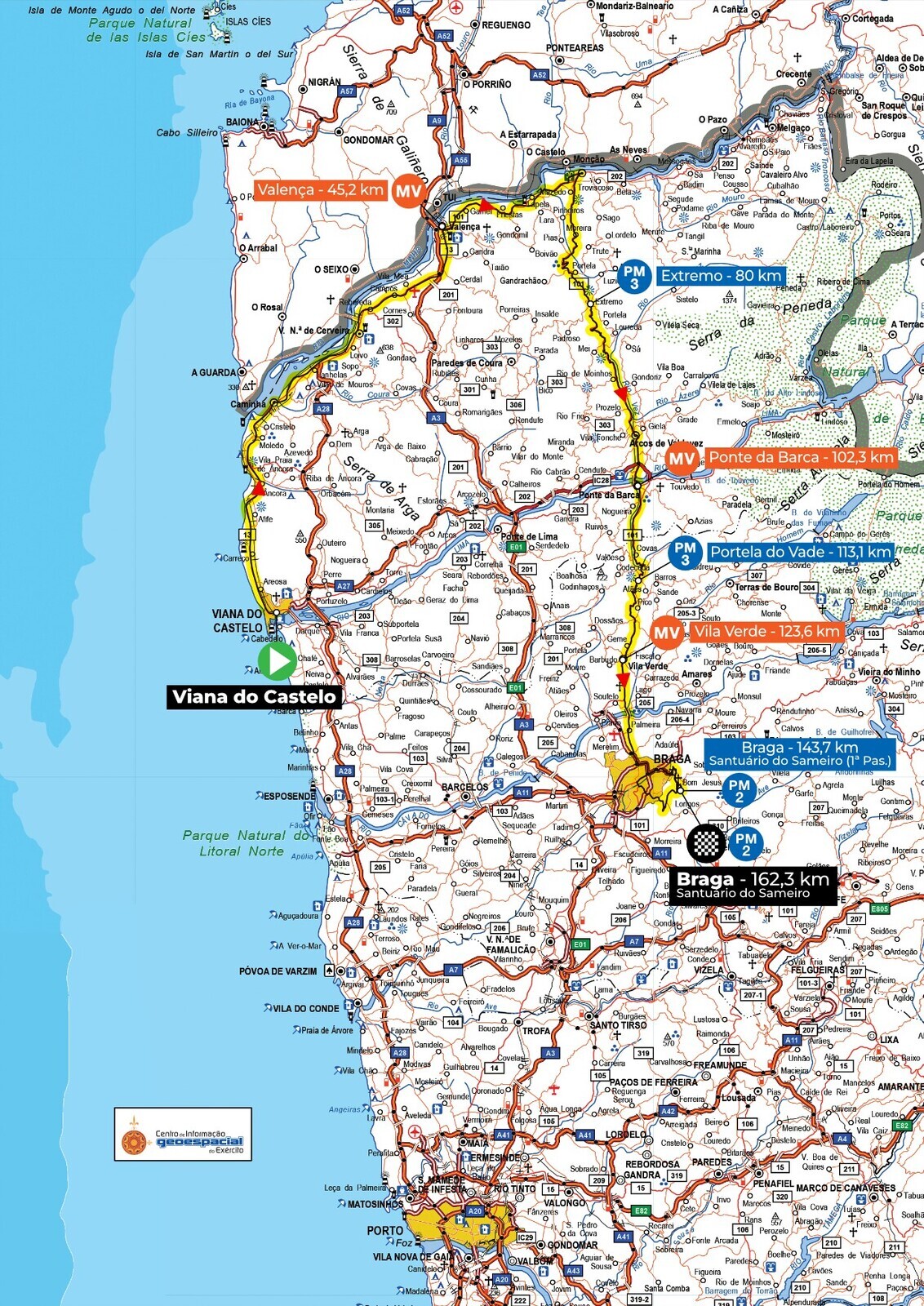 O local de Concentração (11h00) e Partida Simbólica (13h00) será a Alameda 5 de Outubro. Ao longo dos cerca de 162 km da Etapa, a “Caravana” passará em Caminha, Vila Nova de Cerveira, Valença, Monção, Arcos de Valdevez, Ponte da Barca, Vila Verde e Braga.