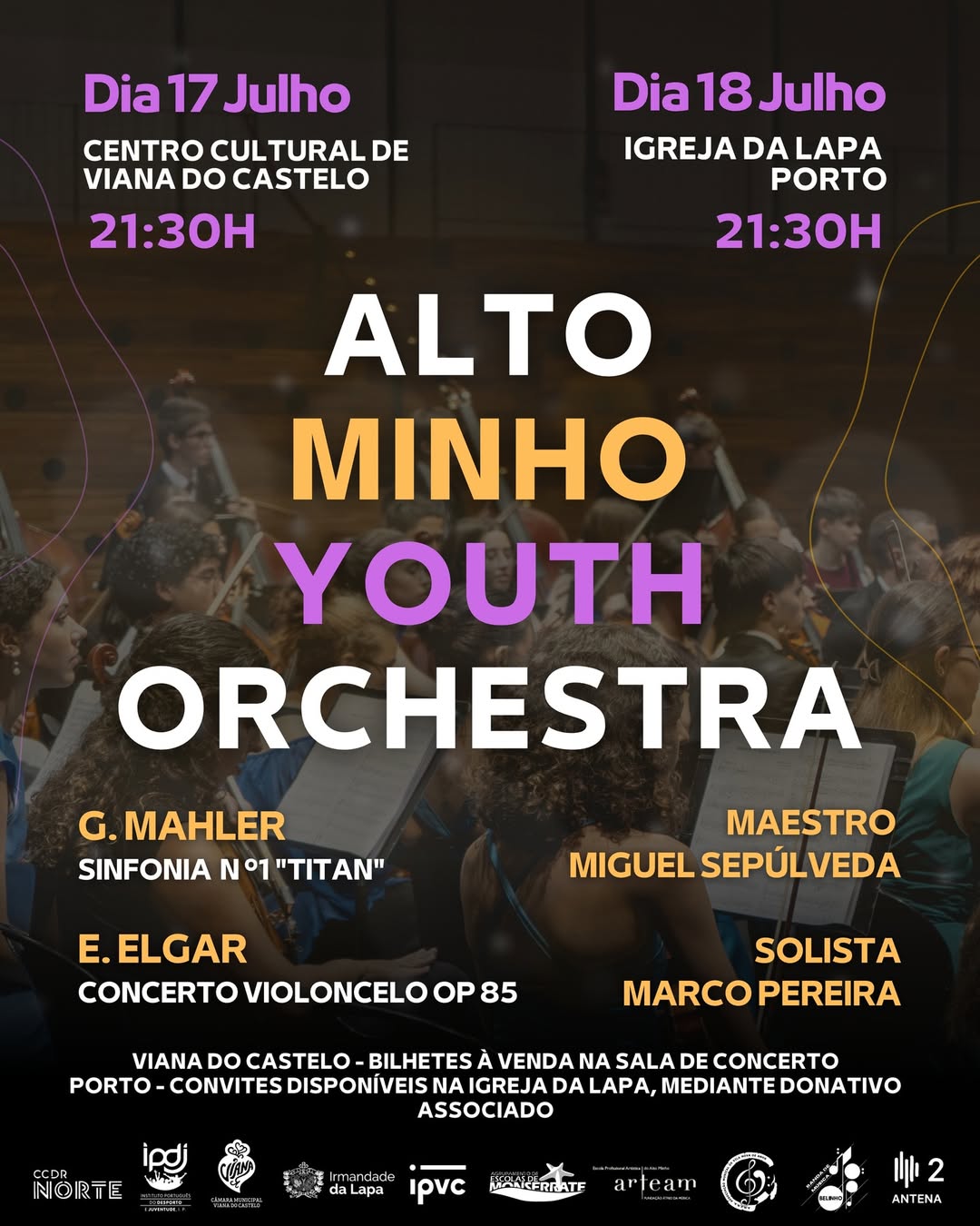 “ A Orquestra do Alto Minho apresenta a quarta edição do estágio de verão Alto Minho Youth Orchestra. Sob a regência do maestro Miguel Sepúlveda e acompanhando o violoncelista Marco Pereira, os mais de 80 jovens músicos de várias nacionalidades apresentar-se-ão em concerto, interpretando o Concerto para Violoncelo, Op. 85 de Edward Elgar e a Primeira Sinfonia de Gustav Mahler. Os Concertos terão lugar no Centro Cultural de Viana do Castelo no dia 17 de julho e na Igreja da Lapa, no Porto, dia 18 de julho.”
