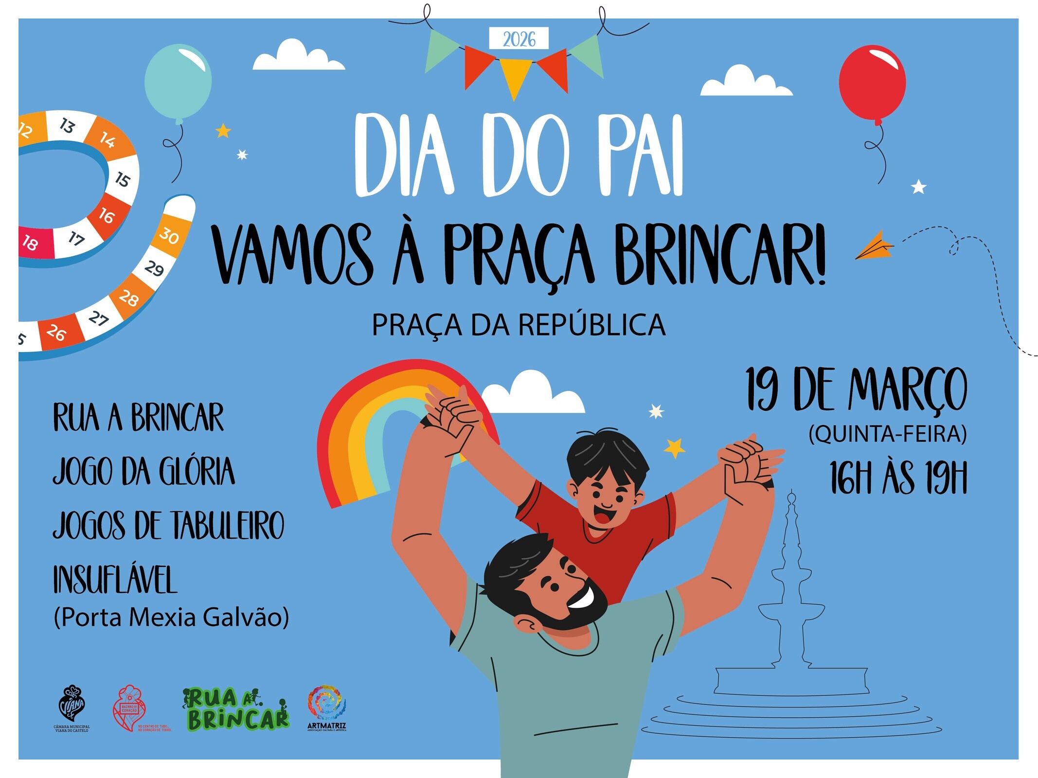 Na próxima quinta-feira, das 16h00 às 19h00, a proposta para o Dia do Pai é a iniciativa “Vamos à Praça brincar”, com um especial Rua a Brincar, um Jogo da Glória em torno do centenário chafariz, jogos de tabuleiro (em parceria com a Artmatriz) e um insuflável na Porta Mexia Galvão, iniciativa enquadrada no “Bairro do Coração” – Bairro Comercial Digital de Viana do Castelo.