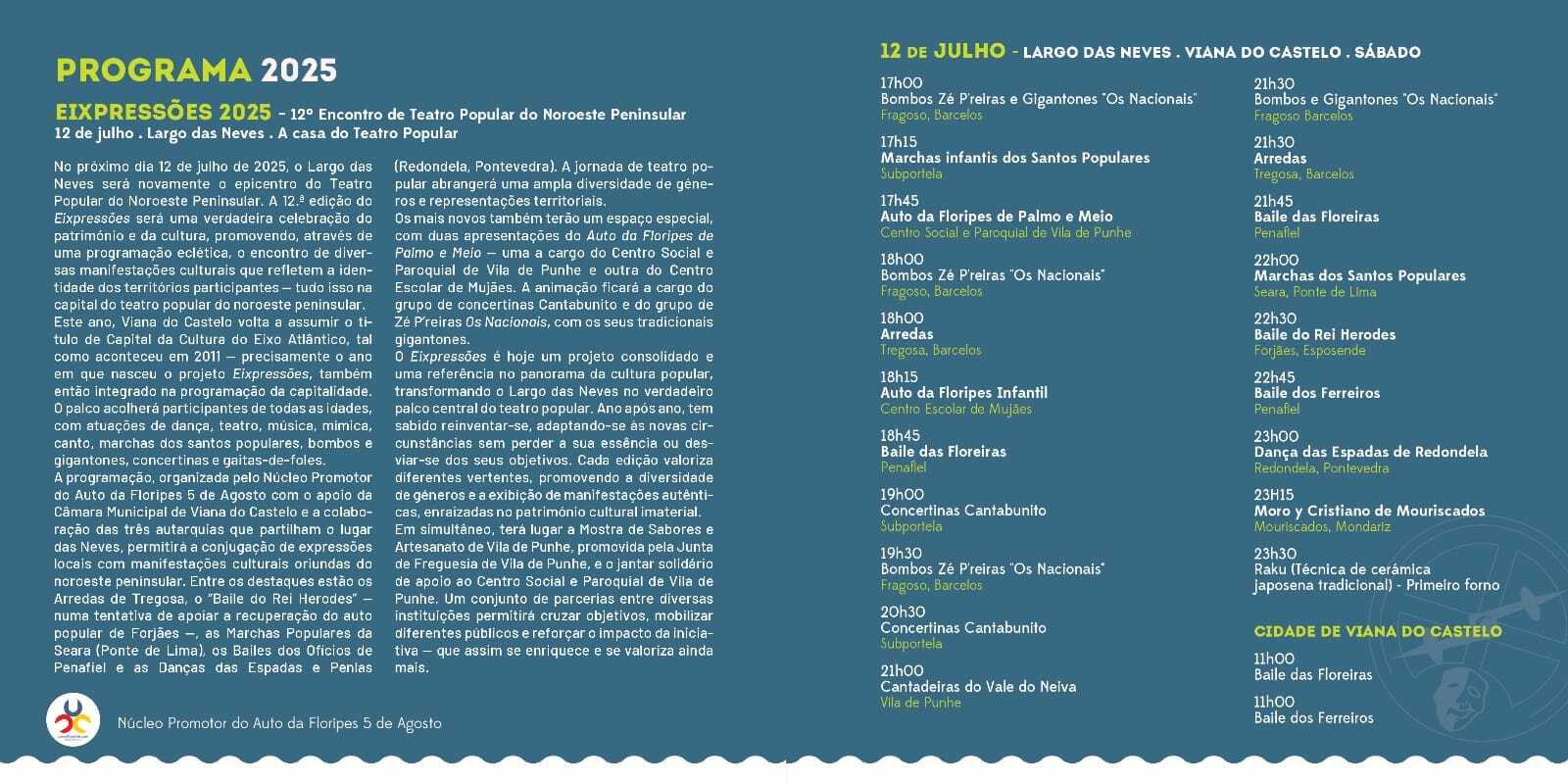 O Largo das Neves será novamente o epicentro do Teatro Popular do Noroeste Peninsular. A 12.ª edição do Eixpressões será uma verdadeira celebração do património e da cultura, promovendo, através de uma programação eclética, o encontro de diversas manifestações culturais que refletem a identidade dos territórios participantes — tudo isso na capital do teatro popular do noroeste peninsular.