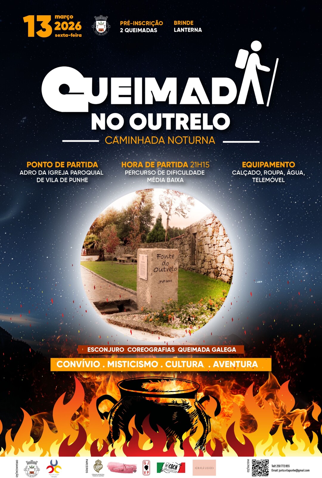 A freguesia de Vila de Punhe volta a acolher, no próximo dia 13 de março de 2026 (sexta-feira), a já emblemática Caminhada Noturna Sexta-feira’13, desta vez dedicada à “Queimada no Outrelo”. Esta iniciativa promove o convívio, o misticismo e a descoberta do território, num ambiente singular marcado pela simbologia da noite e pelo imaginário popular.